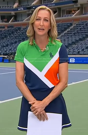Lara Spencer on Good Morning America on ABC was spotted wearing this green, orange and navy colorblock polo shirt and skirt on Good Morning America on Sep 05 2022's episode. Lara's Top is the Ball Girl Colorblocked Polo Top by Polo Ralph Lauren . Lara's Skort is the US Open Tennis Skort by Polo Ralph Lauren.