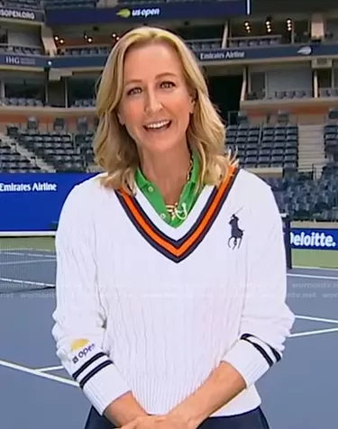 Lara Spencer on Good Morning America on ABC was spotted wearing this white cable knit v-neck sweater on Good Morning America on Sep 05 2022's episode. Lara's Sweater is the US Open Umpire Cable-Knit Sweater by Polo Ralph Lauren.