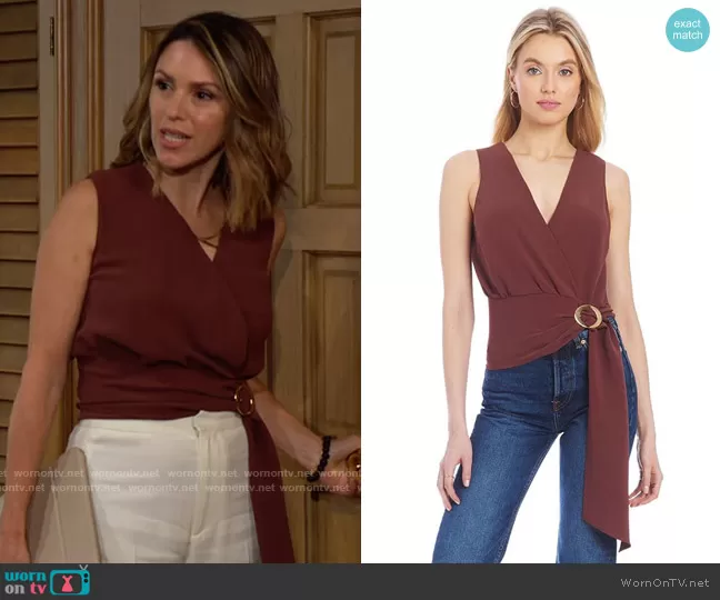 Chloe Mitchell (played by Elizabeth Hendrickson) on The Young and the Restless on CBS was spotted wearing this brown wrap blouse on The Young and the Restless on Sep 05 2022's episode. Chloe's Top is the Tandy Top in Truffle by Amanda Uprichard.