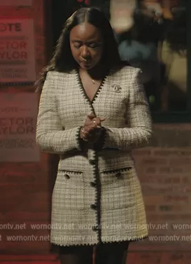 (played by Nia Jervier) on The Chi on ShowTime was spotted wearing this white contrast tweed dress on The Chi on episode 'I Am the Blues' (5x10) in Sep 2022. 's Dress is the Palatine tweed mini dress by Veronica Beard.
