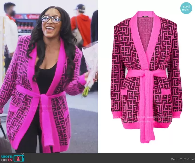Drew Sidora on The Real Housewives of Atlanta on Bravo was spotted wearing this pink monogram logo cardigan on The Real Housewives of Atlanta on episode 'A Fashion Show With Fashions' (14x17) in Sep 2022. Drew's Sweater is the Long Belted Monogram Mohair Cardigan by Balmain.