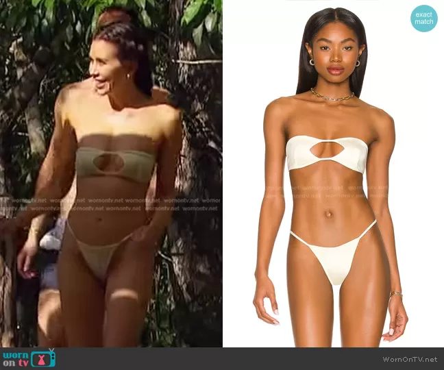Gabriela Windey on The Bachelorette on ABC was spotted wearing this yellow cutout bikini on The Bachelorette on episode 'Week 9' (19x09) in Sep 2022. Gabby's Bikini To is the Bass Bikini Top by Indah . Gabby's Bikini Bottoms is the Buffy Bikini Bottom by Indah.