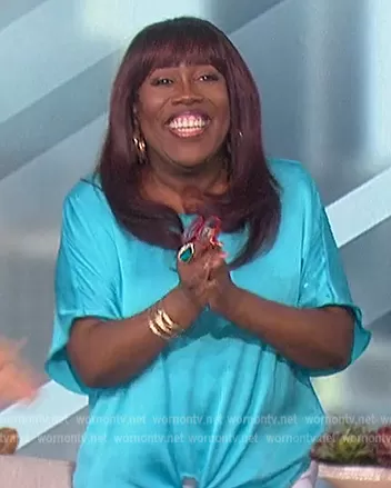 Sheryl Underwood on The Talk on CBS was spotted wearing this blue satin tie front top on The Talk on Jul 27 2022's episode. Sheryl's Top is the Satin Tie-Hem Top by Bar III.