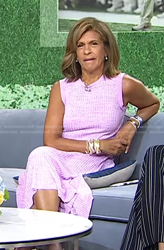 Hoda Kotb on Today on NBC was spotted wearing this pink ribbed sleeveless dress on Today on Apr 12 2023's episode. Hoda's Dress is the Slim-Fit Sleeveless Dress by Boss.