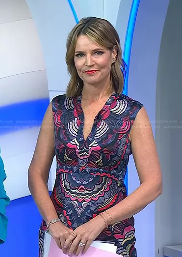 Savannah Guthrie on Today on NBC was spotted wearing this printed sleeveless dress on Today on Apr 20 2023's episode. Savannah's Dress is the Tabitha B Dress In Nightfall Prism Print by Saloni . Savannah's Shoes is the Fae Platform Heel Sandals by Loeffler Randall.