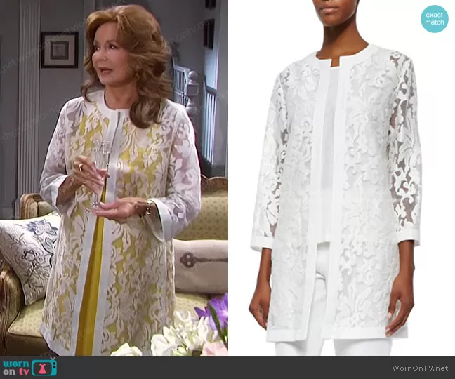 Maggie Horton (played by Suzanne Rogers) on Days of our Lives on Peacock was spotted wearing this white burnout jacket on Days of our Lives on Sep 07 2022's episode. Maggie's Jacket is the Damask Burnout Long Topper Jacket by Neiman Marcus.