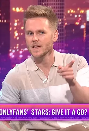 on E! News on E! was spotted wearing this beige colorblock polo on E! News Nightly Pop on Sep 07 2022's episode. 's Shirt is the Tondo Wool-Blend Polo Shirt by Reiss.