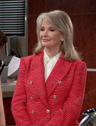 Marlena Evans (played by Deidre Hall) on Days of our Lives on Peacock was spotted wearing this red tweed blazer on Days of our Lives on May 19 2023's episode. Marlena's Jacket is the Textured Double Breasted Blazer by Zara.