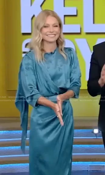 Kelly Ripa on Live with Kelly and Mark on Disney ABC Home Entertainment was spotted wearing this blue satin draped dress on Live with Kelly and Ryan on Dec 20 2022's episode. Kelly's Dress is the Jade Dress by Ronny Kobo in Teal.