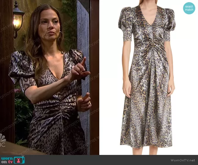 Ava Vitali (played by Tamara Braun ) on Days of our Lives on Peacock was spotted wearing this leopard ruched dress on Days of our Lives on Sep 10 2022's episode. Ava's Dress is the Sierina Puff Sleeve Slit Dress by Rotate.