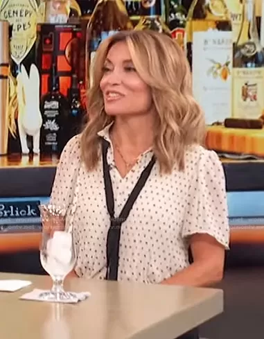 Kit Hoover on Access Hollywood on NBC was spotted wearing this white polka dot tie neck top on Access Hollywood on Sep 16 2022's episode. Kit's Top is the Flutter Sleeve Tie Neck Blouse by Max Studio.