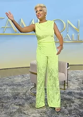 Tamron Hall on Tamron Hall Show on ABC was spotted wearing this green satin top and pants on the Tamron Hall Show on Sep 12 2022's episode. Tamron's Top is the Jacquard Asymmetric Blouse by Christopher John Rogers . Tamron's Pants is the Jacquard Wide Leg Trousers by Christopher John Rogers.