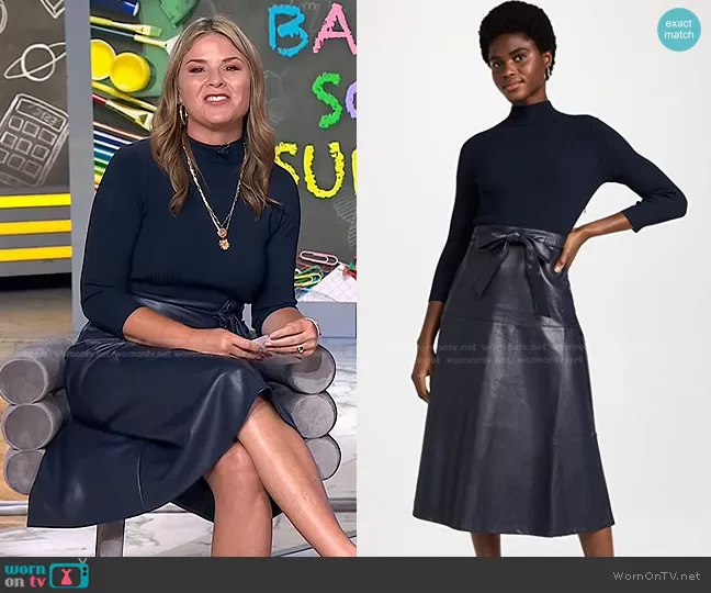 Jenna Bush Hager on Today on NBC was spotted wearing this navy ribbed sweater and leather skirt on Today on Sep 12 2022's episode. Jenna's Dress is the Reade Rib-Knit & Faux Leather Midi-Dress by Shoshanna.