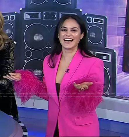 Donna Farizan on Today on NBC was spotted wearing this pink feather cuff blazer on Today on Apr 11 2025's episode. Donna's Jacket is the Straight Cut Feather Blazer by Zara.