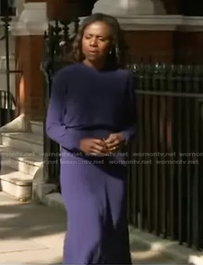 Deborah Roberts on Good Morning America on ABC was spotted wearing this blue long sleeve midi dress on Good Morning America on Sep 12 2022's episode. Deborah's Dress is the Dolman Long Sleeve Cady Crepe Midi Dress by Victoria Beckham . Deborah's Shoes is the Horsebit Mid-Heel Pumps by Gucci.