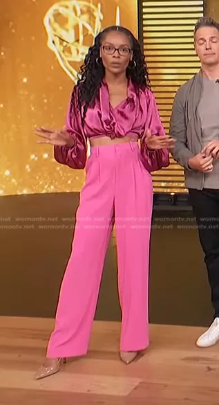 Zuri Hall on Access Hollywood on NBC was spotted wearing this pink cropped top and pants on Access Hollywood on Sep 12 2022's episode. Zuri's Pants is the Wilson Pleated Wide Leg Trousers by Wayf.