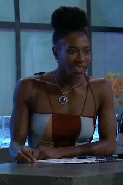 N'neka (played by Arlondriah Lenyéa) on General Hospital on ABC was spotted wearing this colorblock top on General Hospital on Sep 12 2022's episode. 's Top is the Gathered Knit Top by Zara.