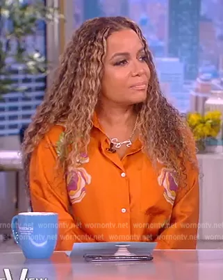 Sunny Hostin on The View on ABC was spotted wearing this orange floral satin blouse and pants on The View on Sep 13 2022's episode. Sunny's Top is the Floral-Print Silk Boy Shirt by LA DoubleJ . Sunny's Pants is the Silk Printed Wide Palazzo Pants by LA Double J.