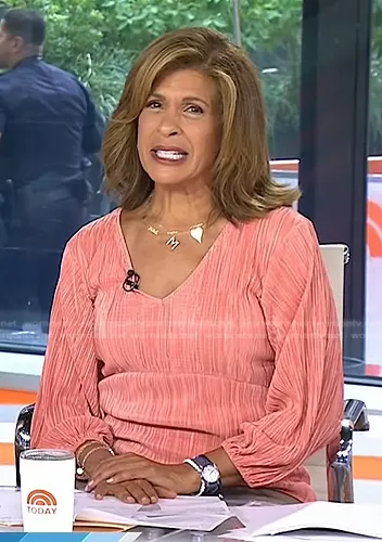 Hoda Kotb on Today on NBC was spotted wearing this pink v-neck pleated top on Today on Jan 12 2023's episode. Hoda's Top is the Plissé Balloon Sleeve Top in Coral Apple by Halogen.