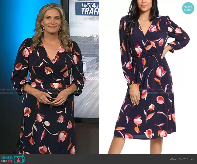 Emily West on Today on NBC was spotted wearing this navy floral surplice dress on Today on Sep 13 2022's episode. Emily's Dress is the Smocked Floral Sheath Dress by London Times.