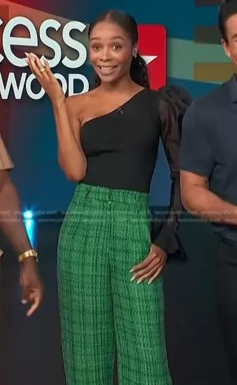 Zuri Hall on Access Hollywood on NBC was spotted wearing this black top and green plaid tweed pants on Access Hollywood on Sep 14 2022's episode. Zuri's Pants is the Tweed Pants by AQUA x Maeve Reilly.