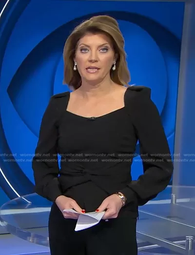Norah O'Donnell on CBS Evening News on CBS was spotted wearing this black twisted waistline top on CBS Evening News on Sep 14 2022's episode. Norah's Top is the Clever Crepe Hartley Top by The Fold.