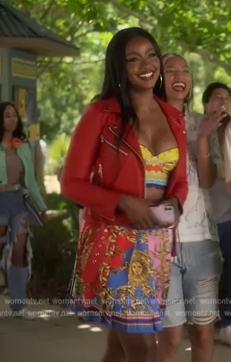 Annika (played by Justine Skye) on Grown-ish on Freeform was spotted wearing this baroque print skirt and top on Grown-ish on episode 'It's a Vibe' (5x09) in Sep 2022. Annika's Top is the Baroque print Crop Top by Versace . Annika's Skirt is the Mini Skirt by Versace . Annika's Jacket is the Belted faux leather biker jacket by Bershka.