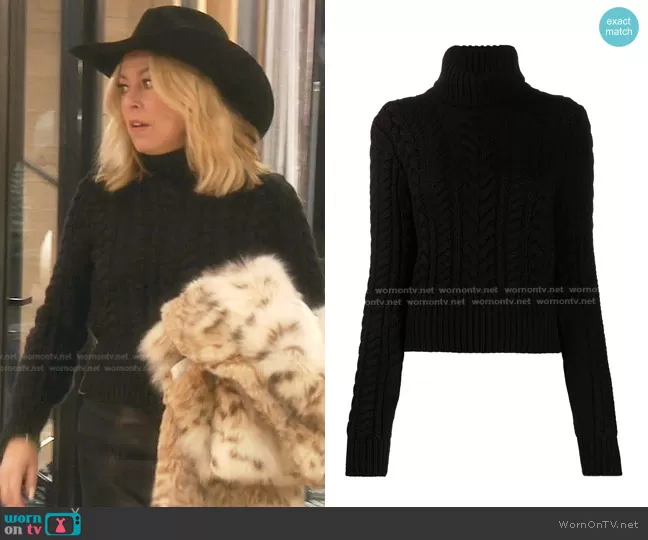 Sutton Stracke on The Real Housewives of Beverly Hills on Bravo was spotted wearing this black cable knit turtlneck sweater on The Real Housewives of Beverly Hills on episode 'Rocky Mountain Bye' (12x18) in Sep 2022. Sutton's Sweater is the Cashmere Cable-Knit Jumper by Dolce & Gabbana.