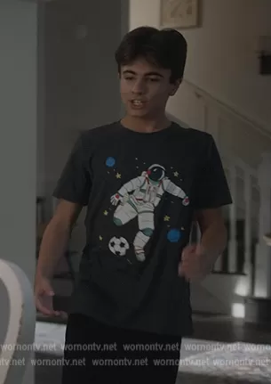 (played by Trae Romano) on Stargirl on DC Universe was spotted wearing this black astronaut print tee on Stargirl on episode 'The Blackmail' (3x03) in Sep 2022. 's Shirt is the Short Sleeve Astronaut Soccer Graphic T-Shirt by Cat & Jack.