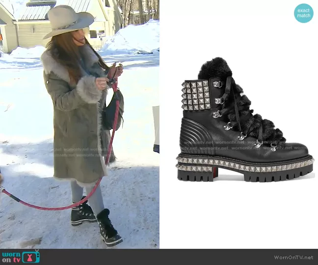 Kyle Richards on The Real Housewives of Beverly Hills on Bravo was spotted wearing this studded combat boots on The Real Housewives of Beverly Hills on episode 'Rocky Mountain Bye' (12x18) in Sep 2022. Kyle's Shoes is the Yeti Donna Shearling Combat Boots by Christian Louboutin.