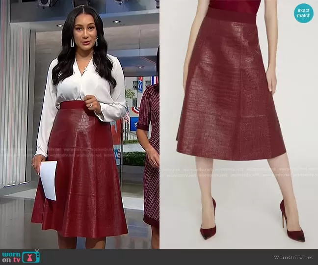 Morgan Radford on NBC News Daily on NBC was spotted wearing this burgundy leather skirt on NBC News Daily on Sep 13 2022's episode. Morgan's Skirt is the Sosie Croc Leather Midi Skirt by Alice + Olivia.