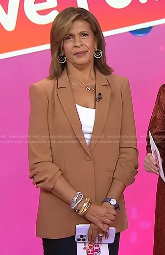 Hoda Kotb on Today on NBC was spotted wearing this brown ruched sleeve blazer on Today on Jan 25 2024's episode. Hoda's Jacket is the Crepe Khloe Blazer by Cinq a Sept.