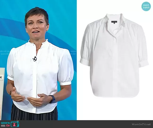 Stephanie Gosk on Today on NBC was spotted wearing this white puff sleeve blouse on Today on Oct 25 2023's episode. Stephanie's Top is the Jordan Ruffle Collar Top by Rag & Bone.