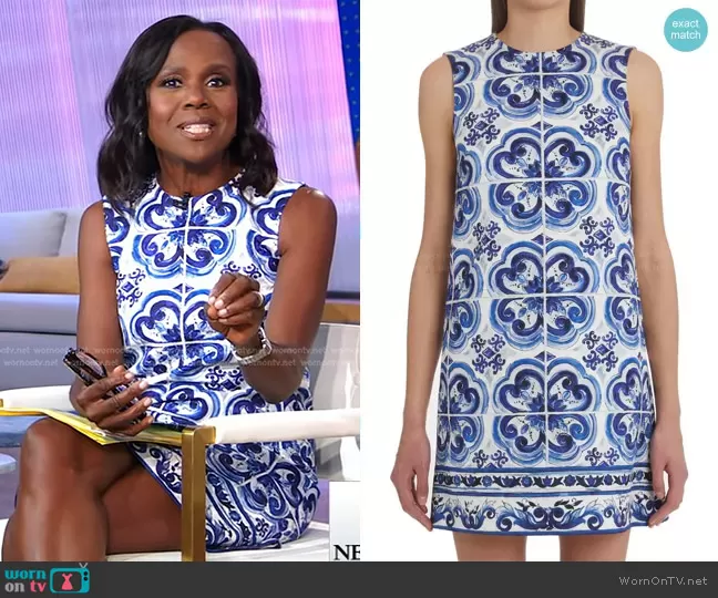 Deborah Roberts on Good Morning America on ABC was spotted wearing this blue and white printed sleeveless dress on Good Morning America on Aug 09 2024's episode. Deborah's Dress is the Blu Mediterraneo Sleeveless A-Line Minidress by Dolce & Gabbana . Deborah's Shoes is the Azia 95 Satin Sandal by Jimmy Choo.