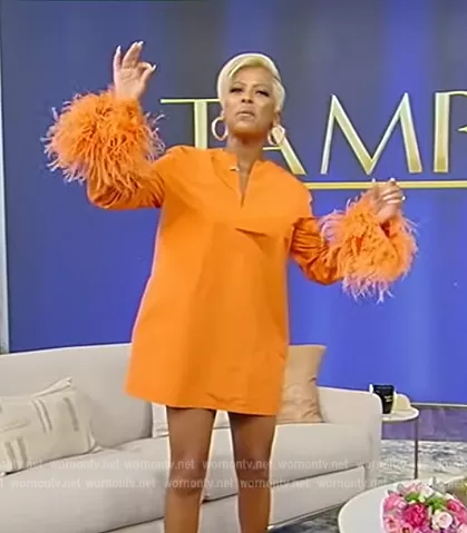 Tamron Hall on Tamron Hall Show on ABC was spotted wearing this orange feather trim dress on Tamron Hall Show on Sep 16 2022's episode. Tamron's Dress is the Feather Trim Long Sleeve Mini Dress by Valentino.