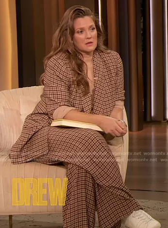 Drew Barrymore on The Drew Barrymore Show on CBS was spotted wearing this brown check blazer and cami on The Drew Barrymore Show on Oct 24 2022's episode. Drew's Top is the Everly Cami by Cami NYC . Drew's Blazer is the Jayda Houndstooth Double-Breasted Blazer by L'Agence . Drew's Pants is the Pilar Houndstooth Check Wide Leg Pants by L'Agence.