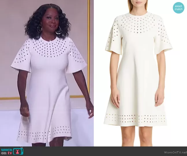 on The Jennifer Hudson Show on FOX was spotted wearing this white eyelet detail mini dress on The Jennifer Hudson Show on Sep 16 2022's episode. 's Dress is the Eyelet Detail Knit Fit & Flare Dress by Lela Rose.