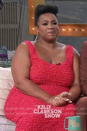 on The Kelly Clarkson Show on NBC was spotted wearing this red textured sleeveless dress on on The Kelly Clarkson Show on Sep 19 2022's episode. 's Dress is the Sloan modal-cloqué midi dress by Mara Hoffman.
