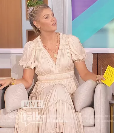 Amanda Kloots on The Talk on CBS was spotted wearing this ruffle trim midi dress on The Talk on Sep 19 2022's episode. Amanda's Dress is the Rose Tiered Dress by Ulla Johnson . Amanda's Shoes is the Penny High Heel Pleated Knot Slide by Loeffler Randall.