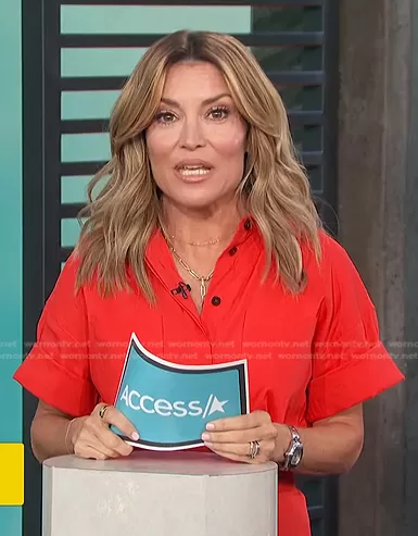 Kit Hoover on Access Hollywood on NBC was spotted wearing this red belted shirtdress on Access Daily on Nov 25 2022's episode. Kit's Dress is the Eco Crunch Belted Mini Shirtdress with Black Buttons by Theory.