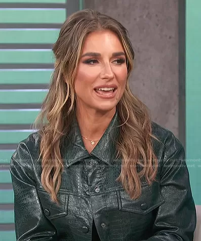 on Access Hollywood on NBC was spotted wearing this green leather jacket and skirt on Access Hollywood on Sep 19 2022's episode. 's Jacket is the Hendrix Jacket by Veronica Beard . 's Skirt is the Delfina Skirt by Veronica Beard.