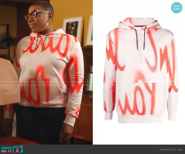 Henrietta Wilson (played by Aisha Hinds) on 9-1-1 on ABC was spotted wearing this pink graffiti print hoodie on 9-1-1 on episode 'Let The Games Begin' (6x01) in Sep 2022. Hen's Sweater is the Logo-Print Drawstring Hoodie by Paul Smith.