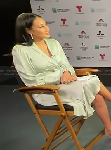 on Today on NBC was spotted wearing this green satin wrap dress on Today on Sep 20 2022's episode. 's Dress is the Asymmetric Ruffled Silk-Satin Wrap Dress by Zimmermann.