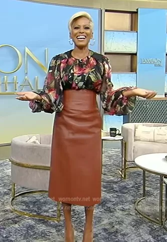 Tamron Hall on Tamron Hall Show on ABC was spotted wearing this black floral print blouse on Tamron Hall Show on Sep 21 2022's episode. Tamron's Top is the Gathered floral-print silk-chiffon blouse by Dolce & Gabbana . Tamron's Skirt is the Leather midi skirt by Dolce & Gabbana.