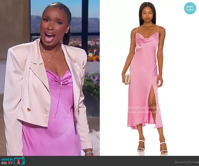 Jennifer Hudson on The Jennifer Hudson Show on FOX was spotted wearing this pink satin slip dress and blazer on The Jennifer Hudson Show on Sep 21 2022's episode. Jennifer's Dress is the Gaia Dress by ASTR the Label . Jennifer's Blazer is the Eboni Cropped Double-Breasted Blazer by Kimberly Goldson . Jennifer's Shoes is the Wide Fit Soraya knotted slingback mid heeled shoes in lime by ASOS.
