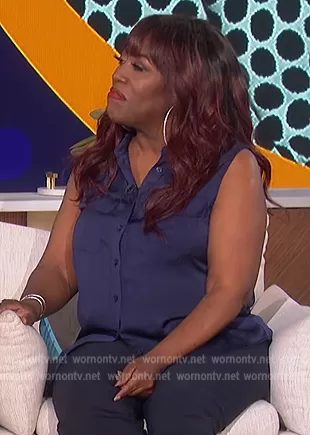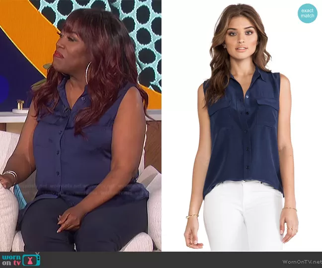 Sheryl Underwood on The Talk on CBS was spotted wearing this navy sleeveless top on The Talk on Sep 21 2022's episode. Sheryl's Top is the Sleeveless Slim Signature by Equipment.