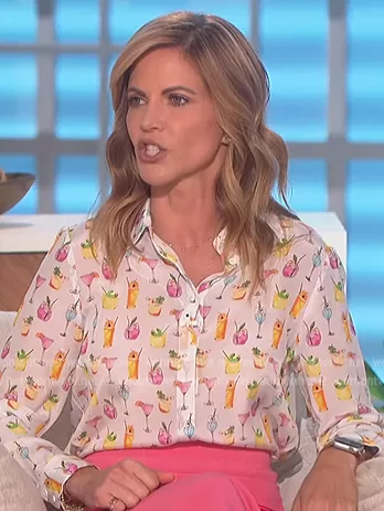 Natalie Morales on The Talk on CBS was spotted wearing this white cocktail print blouse on The Talk on Sep 21 2022's episode. Natalie's Top is the Willa Silk Blouse by Alice and Olivia.