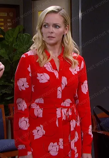 Belle Brady (played by Martha Madison) on Days of our Lives on Peacock was spotted wearing this red floral shirtdress on Days of our Lives on Sep 22 2022's episode. Belle's Dress is the Orelia Floral Print Midi Dress by Hobbs London.
