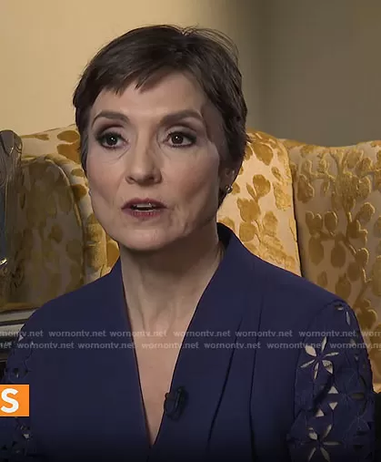 Catherine Herridge on CBS Mornings on CBS was spotted wearing this navy blue eyelet sleeve dress on CBS Mornings on Mar 13 2023's episode. Catherine's Dress is the Embroidered Sleeve Dress by Elie Tahari .