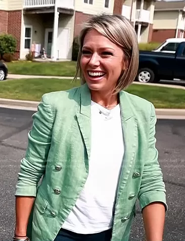 Dylan Dreyer on Today on NBC was spotted wearing this green double breasted blazer on Today on Sep 22 2022's episode. Dylan's Jacket is the Diego Linen Blend Dickey Jacket by Veronica Beard.